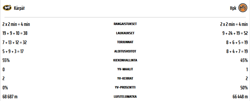 Lauantai-iltapäivällä aloitettiin viikonlopun toinen Kärpät-HPK ottelu – ensimmäisen vei Kärpät joten tänään oli HPK:n vuoro. HPK pelasi tuloksellisesti ensimmäisen erän tasan ja oli loput 40 minuuttia vahvempi joukkue. Kainulaisen ja Päivärinnan maaleilla sekä Sinclairin 19 torjunnalla HPK nappasi täyden pistepotin viikonlopun toisesta keskinäisestä kohtaamisesta ja nousi sarjataulukossa jälleen Kärppien yläpuolelle.