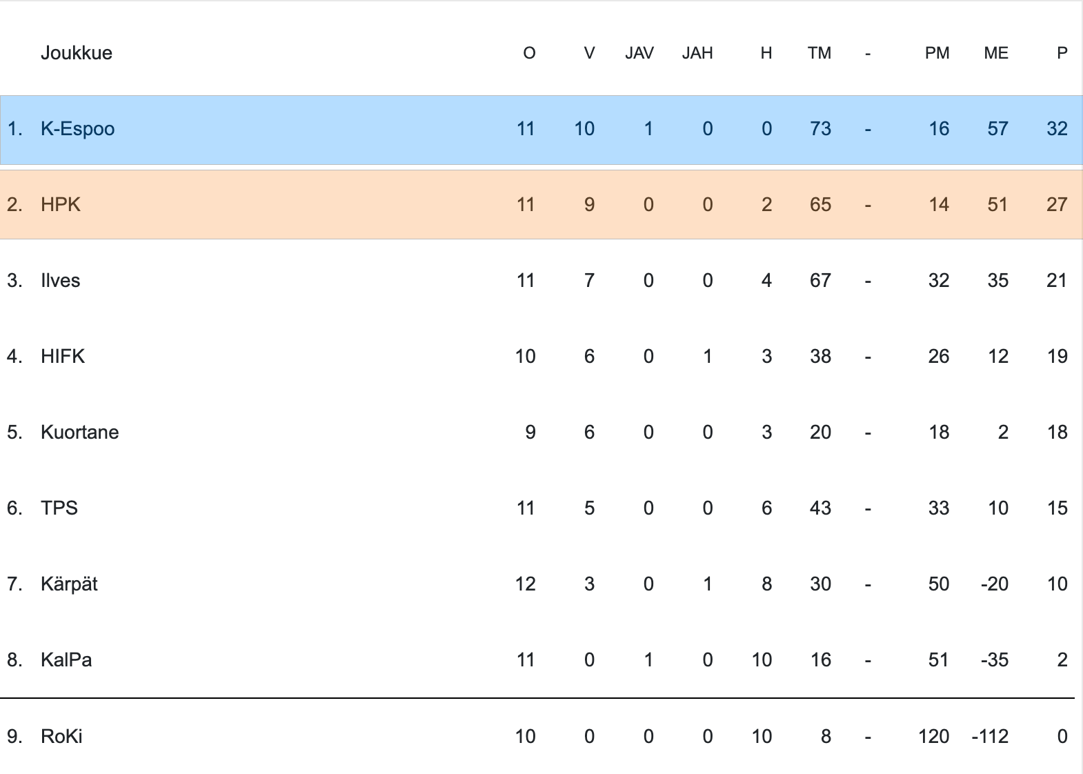 HPK saa perjantai-iltana kovan haasteen, kun K-Espoo saapuu Pohjantähti Areenalle. Espoolaiset ovat aloittaneet kauden hurjassa vireessä – joukkue on voittanut kaikki yksitoista otteluaan ja menettänyt pisteitä vain kerran, kun HIFK vei ottelun jatkoajalle. Lisäpiste jäi kuitenkin Espooseen, joten K-Espoo johtaa sarjaa 32 pisteellä.