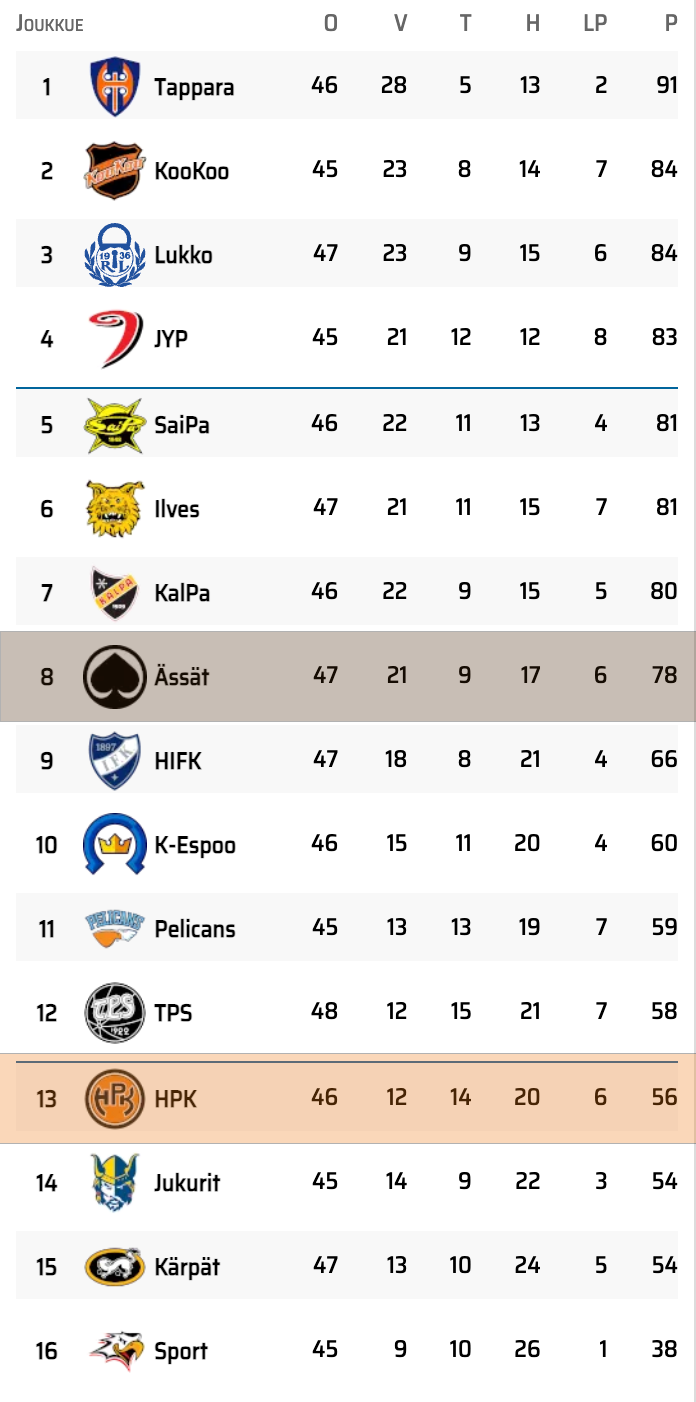 Ässien maalinsuulla on operoinut Jan Bednarin ollessa loukkaantuneena HPK:laisille tuttu Filip Lindberg. Fille on torjunut viimeiset neljä ottelua torjuntaprosentilla 91,6. Ässien kultakypärää kantaa Jonne Tammela (14+18=32). Tammelan takana pistepörssissä on Jan-Mikael Järvinen (11+20=31), sekä Nestor Noiva (8+22=30).