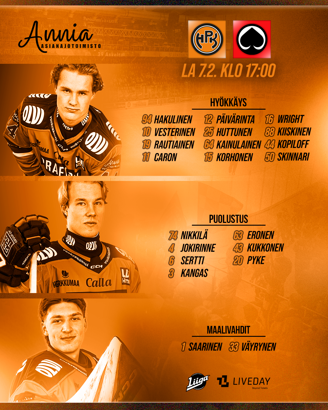 HPK kohtaa viikon toisessa ottelussa kotiaskissaan Porin Ässät. Ottelu pelataan ysäri-teemalla. Parhaat pukeutujat palkitaan! Matsin jälkeen Yö-Kerho O’ranssissa, jossa levyjä pyörittää legendaarinen DJ Jartsa. Ottelu alkaa klo 17:00! Matsibuffassa chimichurribroileri & paahdetut perunat. Liput ja matsibuffa totutusti täältä!