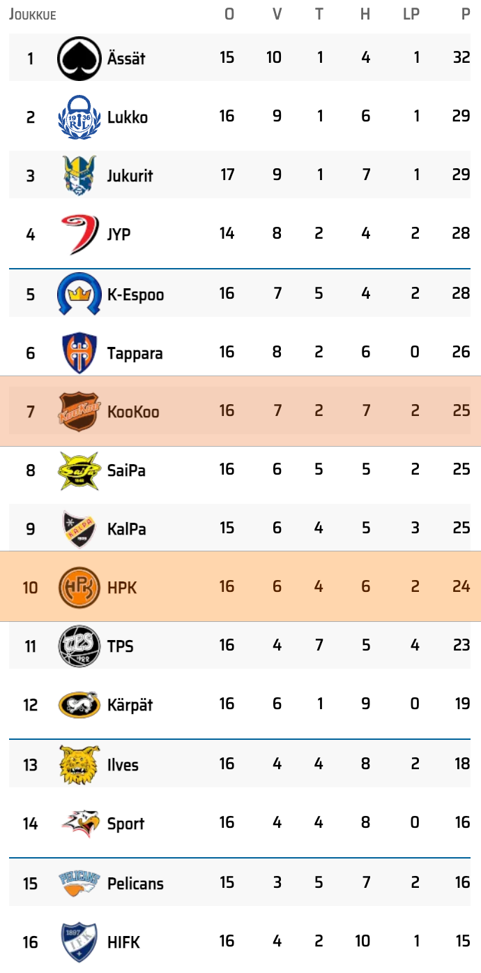 KooKoo on nyt sarjataulukon sijalla seitsemän, kun kuudentoista pelatun ottelun jälkeen kouvolalaiset ovat keränneet 25 pistettä. HPK on kuudentoista pelin otannalla kerännyt 24 pistettä ja se oikeuttaa sarjataulukon sijaan kymmenen. Sarjan tasaisuudesta kertoo se, että sijat 4-11 ovat kaikki viiden pisteen sisällä ja sijat 2 & 3 ovat hekin vain yhden pisteen enemmän keränneet, joten jokainen piste on äärimmäisen tärkeä ja voi muuttaa sarjasijoitusta huomattavasti.