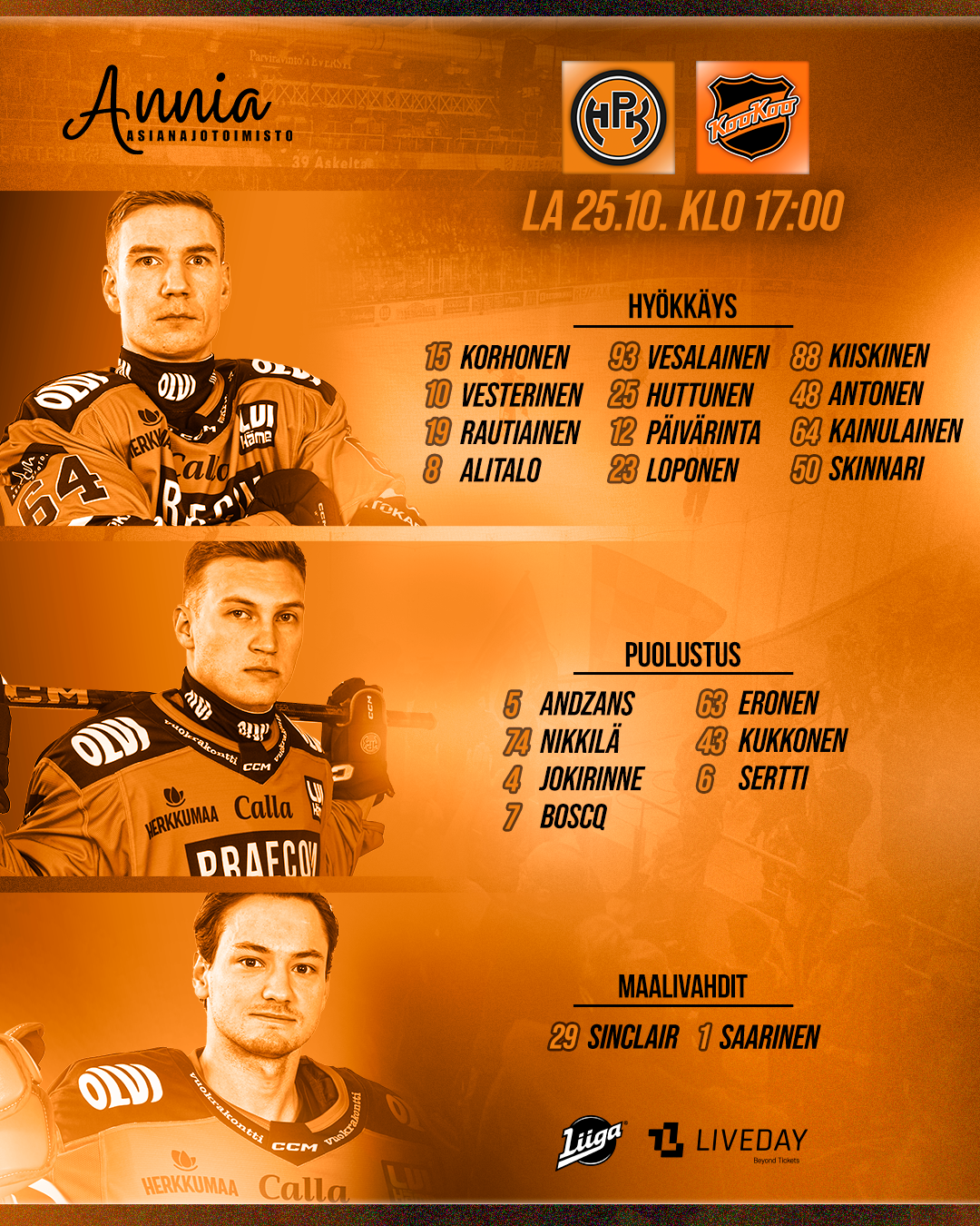 HPK & KooKoo pelaavat lauantaina back-to-back-viikonlopun toisen kohtaamisen, kun kiekko tippuu jäähän lauantaina klo 17. Joukkueet kohtasivat perjantai-iltana Kouvolassa, jossa KooKoo oli parempi 5-2. Ottelu kulki pitkälti KooKoon komennossa, vaikka HPK:llakin oli hetkensä. Kotijoukkue aloitti vahvasti ja iski heti ylivoimalla johtoon. HPK pääsi peliin mukaan Markus Loposen Liiga-uran avausmaalilla, mutta sen jälkeen KooKoo otti ohjat takaisin. HPK-vahti Kim Saarinen torjui useita tärkeitä koppeja, ja myös puolustaja Erosen pelastus maaliviivalta piti toivoa yllä. Toisessa päässä KooKoon Jatkola oli jälleen joukkueensa tukipilari torjuen muun muassa Jesse Kiiskisen läpiajon kriittisellä hetkellä.