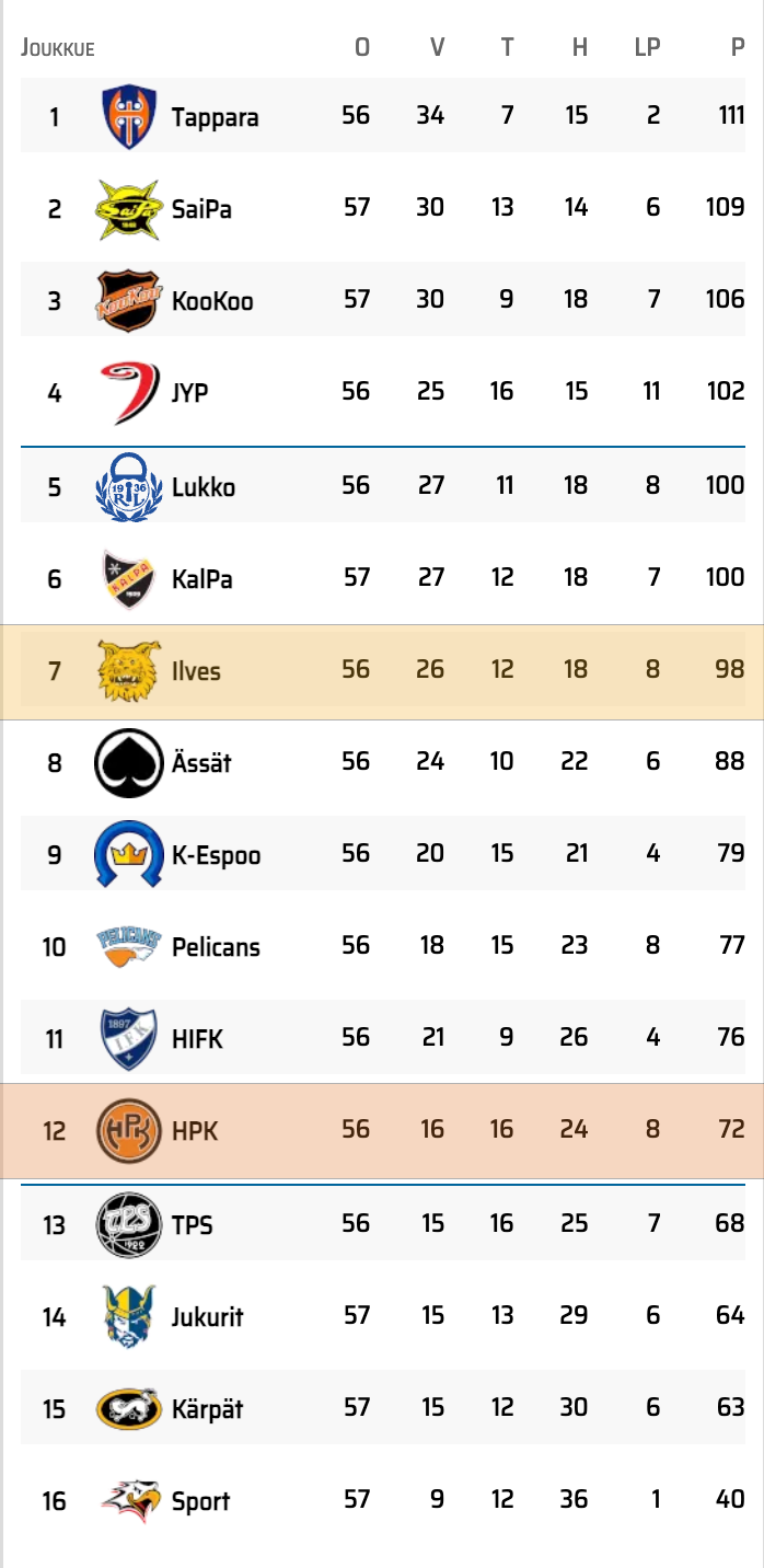 BioRex-otteluennakko Ilves-HPK 10.3. | Taistelu tärkeistä pisteistä jatkuu