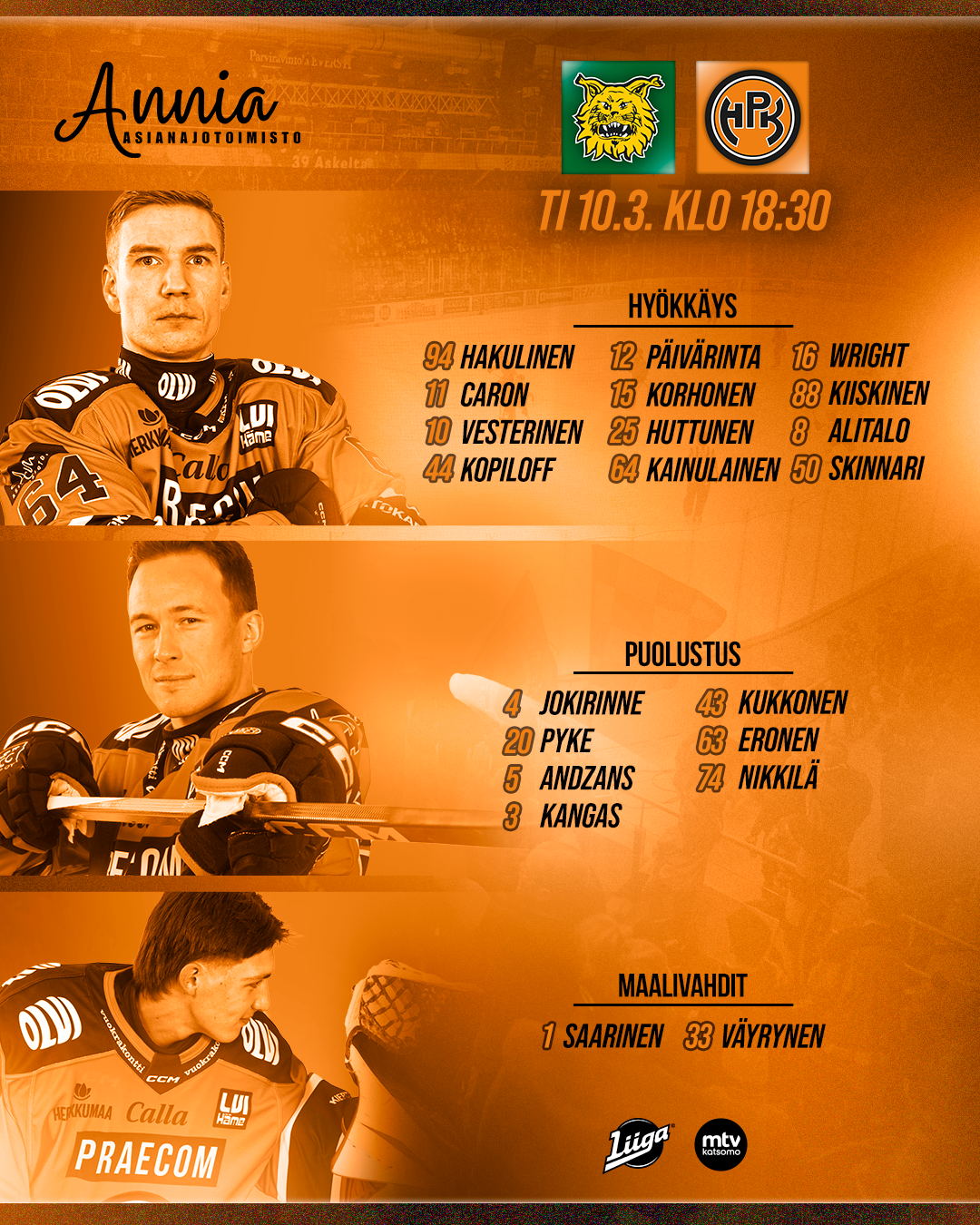 Tiistaina nähdään varmasti kuuma ottelu Nokia Arenalla, jossa jokainen pelaaja antaa kaikkensa. Virittäydy siis vastaanottimien äärelle tai lähde vierasreissulle ja tue Kerhoa kohti Oranssia kevättä!