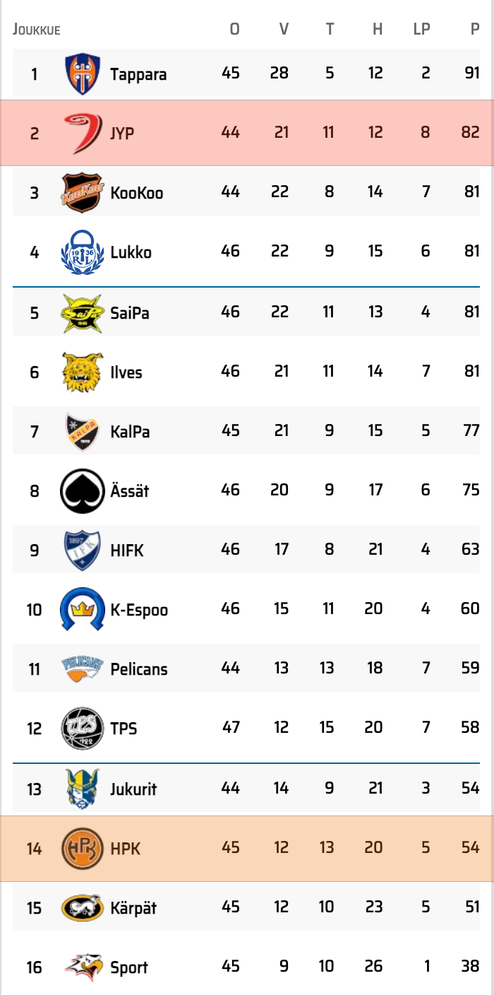 Sarjataulukossa HPK löytyy tällä hetkellä sijalta 15, mutta joukkue on tiukasti mukana taistelussa pudotuspelipaikoista – eroa viivaan on neljä pistettä.