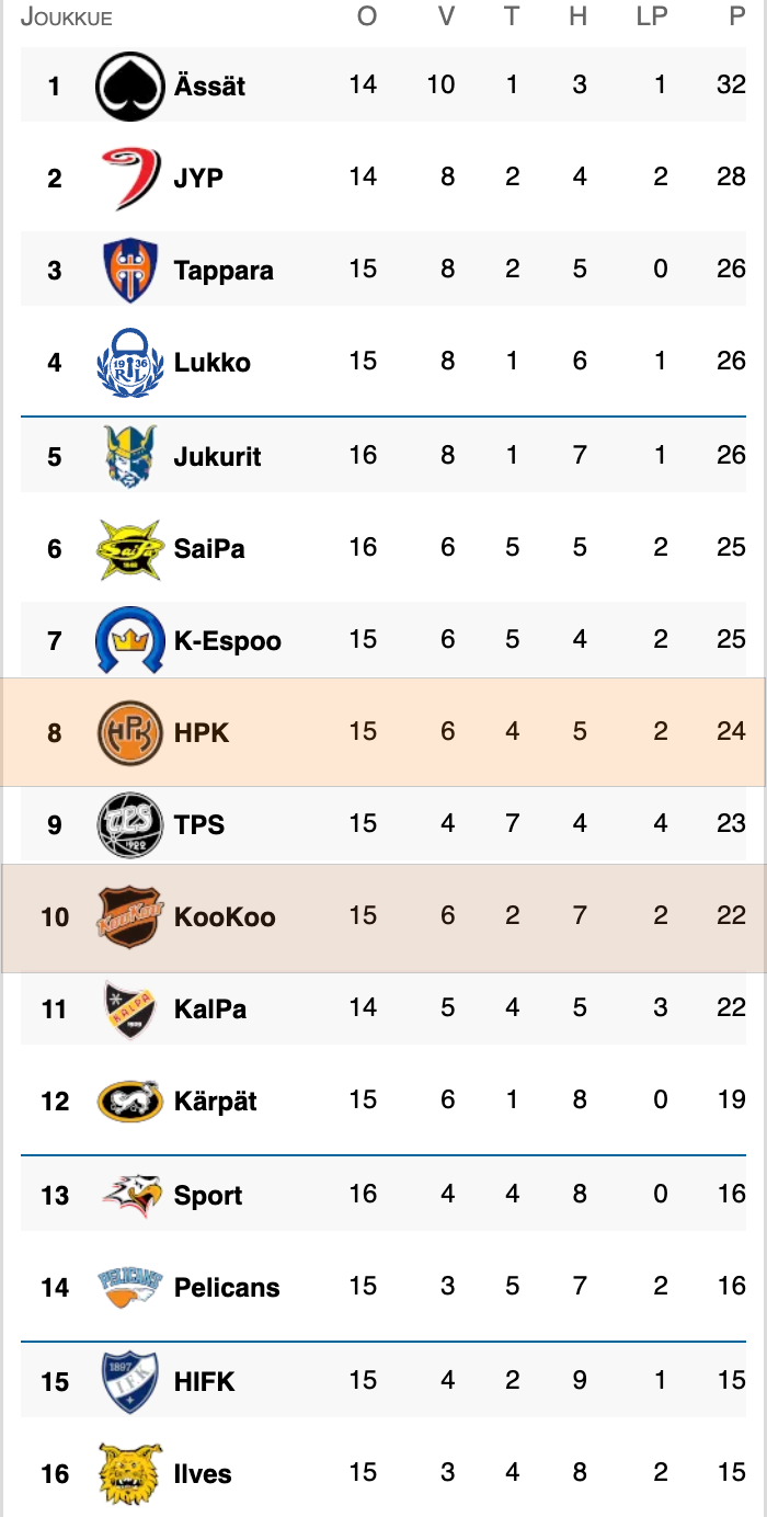 KooKoo:lle perjantain kamppailu on viikon ensimmäinen. KooKoo lähtee katkaisemaan tappioputkeaan, sillä se hävisi viime viikonloppuna molemmat ottelunsa. Perjantaina Rauman Lukko kävi Kouvolasta hakemassa pisteet luvuin 2-5. Lauantaina KooKoo matkusti Kuopioon, jossa vastassa ollut kotijoukkue KalPa voitti ottelun 4-2. Perjantai-iltana vastassa on varmasti sisuuntunut ja kovaa työtä tekevä joukkue, joka haluaa kotiyleisönsä edessä kellistää vierasjoukkue HPK:n.