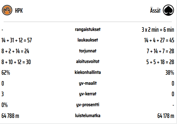 Ottelun alku oli tasainen ja hieman hermostunut, mutta HPK siirtyi kuskin paikalle ottaen pelivälineen haltuun. Erityisesti toisessa erässä HPK painoi hyökkäyksiä Ässien päätyyn ja vierasjoukkue joutui puolustamaan pitkiä aikoja läpi ottelun. Kotijoukkueen vahvasta kokonaisvaltaisesta pelistä kertoo myös tilastoissa 68% kiekonhallinta ja Ässät joutuikin ottelussa kolmesti jäähylle Kerhon painaessa päälle.