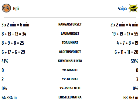HPK pelasi SaiPaa vastaan perjantai-iltana kotiyleisön edessä perhepelin merkeissä. HPK:n ja SaiPan välinen ottelu alkoi tunteikkaissa merkeissä, kun uransa päättänyt Juuso Hietanen saapui Pohjantähti Areenalle pudottamaan avauskiekon. Hämeenlinnalaisyleisö antoi asiaankuuluvat raikuvat aplodit, ja Hietasen vaikutus kotiyleisöön näkyi ja kuului vahvasti. Itse ottelussa HPK pysyi pitkään mukana taistelussa, mutta lopulta SaiPa onnistui kääntämään tiukan kamppailun edukseen ja kasvatti voittoputkensa viiteen otteluun.