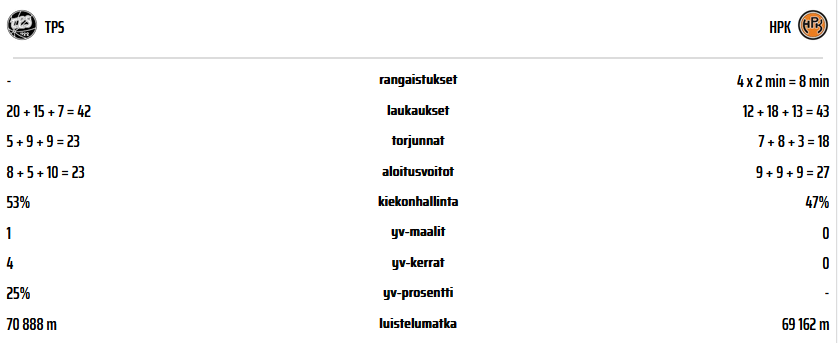 HPK pelasi viikon ensimmäisen ottelunsa Turussa TPS:n vieraana. Tepsi karkasi kahden maalin johtoon kahdella napakalla kudilla ottelun ensimmäisellä kympillä ja viimeisteli illan viimeisen isäntien osuman erän loppuun. Kerho joutui jahtaamaan tulosta läpi pelin, mutta kotijoukkue piti tiukasti johtoa näpeissään. Loppulukemat 3-1 (3-0, 0-1, 0-0).
