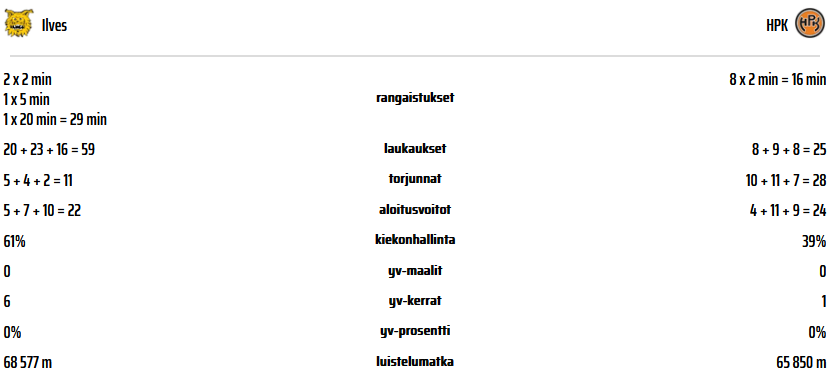 HPK kohtasi Ilveksen Nokia Arenalla tiistai-iltana viikon ensimmäisessä ottelussa. Kotijoukkue jatkoi viime aikoina esittämiään vahvoja otteita ja hallitsi peliä. Kerho pääsi johtoon toisessa erässä ottelun avausmaalilla, mutta maali jäi vierasjoukkueen ainokaiseksi ja loppulukemat olivat lopulta Ilveksen eduksi 3-1 (0-0, 1-1, 2-0).