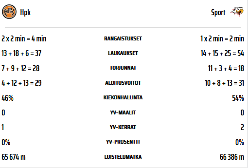 Illan vierasjoukkue saapui Pohjantähti Areenaan pelattuaan maajoukkuetauon jälkeen yhden ottelun. Tappara kylvetti vaasalaisia Sportin kotiyleisön edessä voittaen runsain numeroin. Odottaa sopi siis, että Kerhon pelaajat olisivat tuoreemmalla jalalla, mutta Sportin pelimiehet paremmalla pelituntumalla varustettuna liikenteessä. Ottelu alkoi vierasjoukkueen hallinnassa ja HPK tyytyi puolustamaan enimmäkseen omaa maaliaan. Erän edetessä HPK pääsi paremmin pelaamaan kiekolla ja molemmilla joukkueilla oli muutama laadukas maalipaikka, joista olisi voinut avata maalitilin. Peleihin palannut Cameron Wright alusti erässä Kainulaiselle erinomaisen paikana ja Kainulainen puolestaan Jokirinteelle. Maalit ja jäähyt jäivät erästä uupumaan, joten koppiin mentiin nolla-nolla tilanteessa.