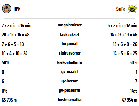 HPK:n pyrkimykset pelin kaventamiseen eivät onnistuneet ja pian SaiPa iski jälleen. Vierasjoukkue ryöväsi kiekon keskialueella ja pääsi iskemään kiekon neljännen kerran Saarisen selän taakse. SaiPa kaunisteli vielä lukemat 1-5, kun kiekko hukkui Kerholta puolustussinisellä ja SaiPa iski jälleen tehokkaasti vastaan. Pelit jatkuvat lauantaina Lappeenrannassa, jossa HPK pääsee hakemaan revanssia perjantai-illan pettymyksen jälkeen.
