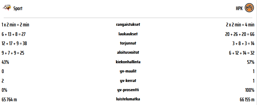 HPK saa kolmannen erän alkuhetkillä helpottavan osuman, kun Vesterinen laukoo Päivärinnan aloitusvoiton jälkeen tarkalla laukauksella tolpan juureen. Kerho on jo kolme maalia edellä. Pian Sport saa mahdollisuuden kavennukseen, kun Sport-peluri pääsee läpiajoon ja Nikkilä joutuu rikkomaan rankkarin arvoisesti. Kohtuullisen rauhallista iltaa viettänyt Saarinen joutuu kovaan paikkaan, mutta selviää hienosti ja torjuu yrityksen patjallaan. Erä menee pitkälti pelaillessa aikaa kellosta pois ja HPK kaunistelee lukemia vielä vajaa kaksi minuuttia ennen loppusummeria. Hakulinen lähettää kiekon viivalta ja Wright ohjaa loppulukemat 0-4. Kim Saariselle kauden kolmas nollapeli neljällätoista torjunnalla ja HPK:lle elintärkeät kolme pistettä!