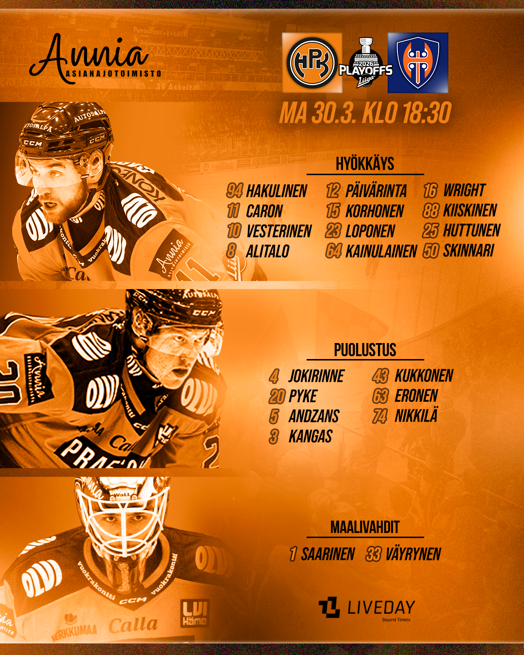 ma 30.3. klo 18:30 HPK-Tappara