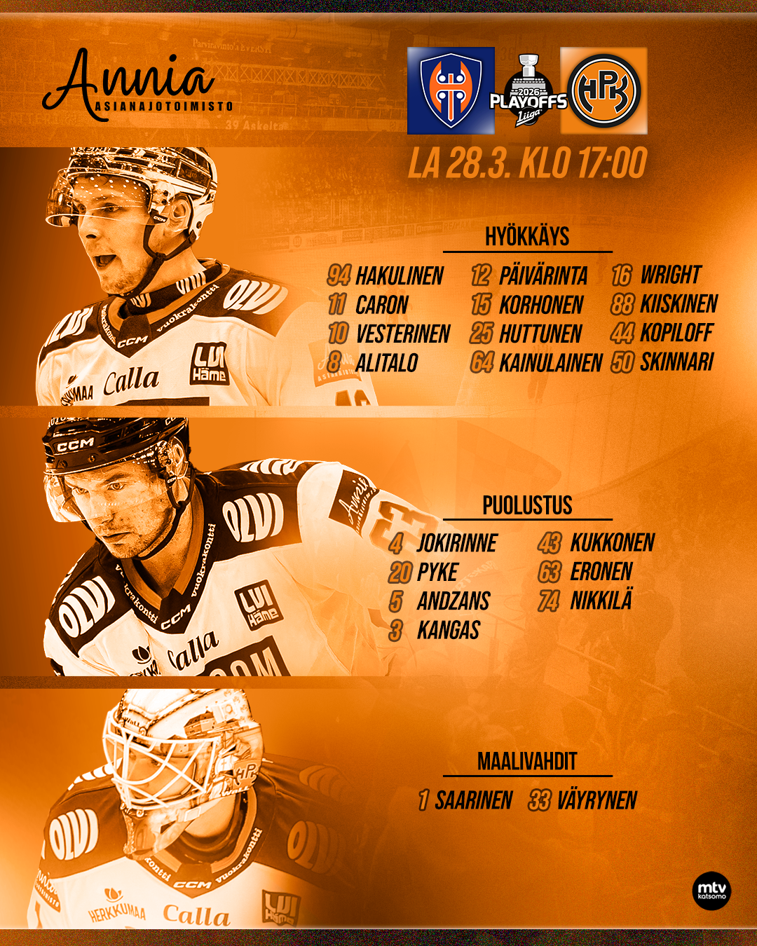 HPK onnistui tiputtamaan playoffsien 1. kierroksella sensaatiomaisesti Rauman Lukon ja nyt puolivälierissä vastaan asettuu runkosarjan voittaja Tappara. Sarja alkaa lauantaina Tampereelta ja ensimmäinen kotiottelu Hämeenlinnassa pelataan maanantaina. Lauantain ottelu alkaa klo 17:00 ja on katsottavissa MTV Katsomon tilauksella.