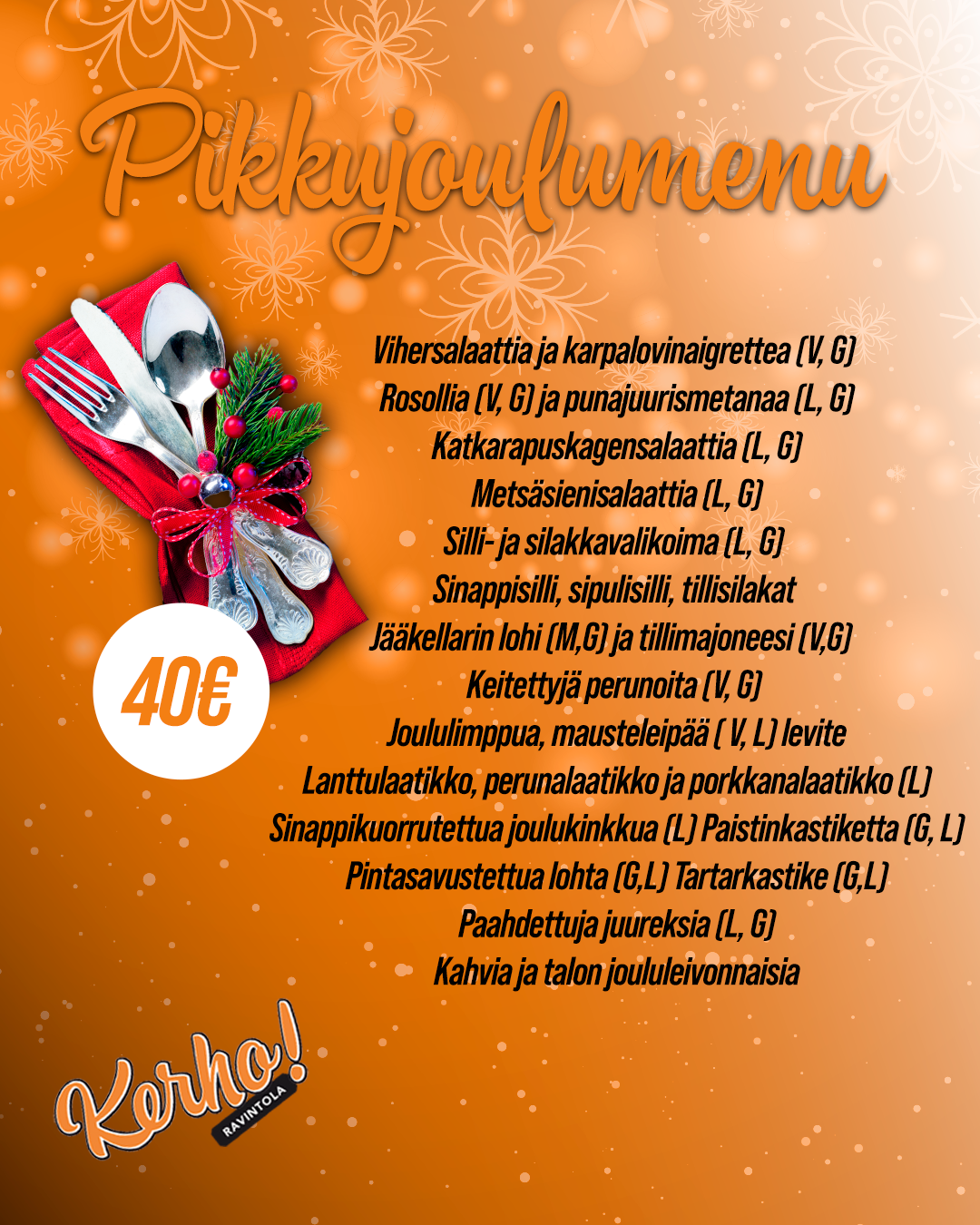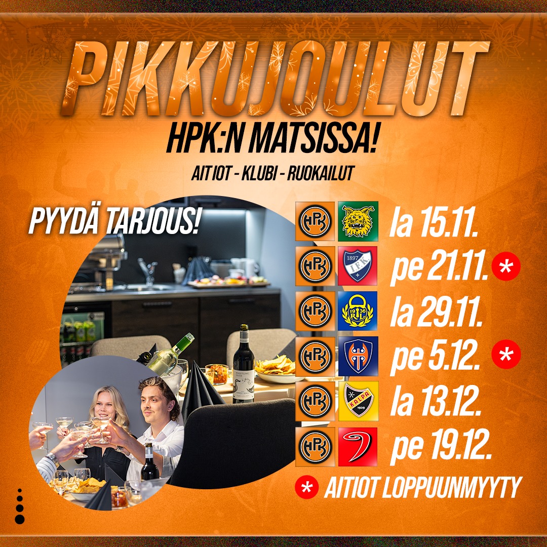 Kerho-ravintolassa juhlitaan pikkujouluja perinteisen joulupöydän herkkujen äärellä HPK-Ilves-ottelussa lauantaina 15.11.2025. Pikkujouluihin sopivan ruokailun hinta on 40 € / hlö.