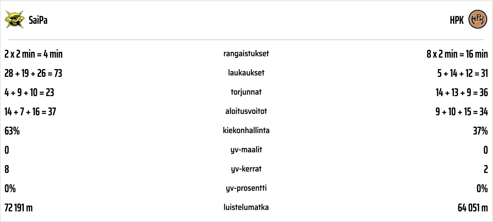 HPK tuli lauantain otteluun pirteästi ja pääsi maalipaikoille heti ottelun alussa. Ensimmäisessä vaihdossa Viljami Jokirinne murtautui maalin eteen, mutta SaiPan maalivahti Grigals veti pidemmän korren. HPK keräsi ottelussa lopulta 16 minuuttia jäähyjä, joista ensimmäinen tuomittiin Thomas Caronille korkeasta mailasta, kun ottelua oli pelattu karvan alle viisi minuuttia. HPK:n alivoima oli tänään timanttia, eikä takaiskuja alivoimilla nähty. Ajassa 7:49 rävähti: Jesse Kiiskinen antoi ensin itse takapainetta Emil Kuuslalle ja taustalta tullut Harri Kainulainen vei kiekon ja nosti kiekolla hyökkäysalueelle. Kaksi yhtä vastaan hyökkäyksessä Kainulainen siirsi kiekon Kiiskiselle, jonka one-timer painui vastustamattomasti verkon perukoille. HPK istui ensimmäisessä erässä vielä kolme kaksiminuuttista, mutta puolustus kesti ja viimeisenä lukkona Kim Saarinen torjui 14 kertaa ensimmäisessä erässä.