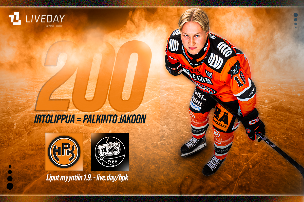 HPK:n runkosarjan 2025-2026 lipunmyynti käynnistyy maanantaina 1.9. klo 12:00 osoitteessa live.day/hpk. HPK järjestää 9.9. HPK-TPS -otteluun lipun ostaneiden kesken arvontaa, jossa jokaisesta kahdestasadasta (200) live.day/hpk-verkkokaupasta myydystä lipusta tulee uusi palkinto jakoon. Maanantaina kannattaa siis olla valmiina, kun lipunmyynti käynnistyy!