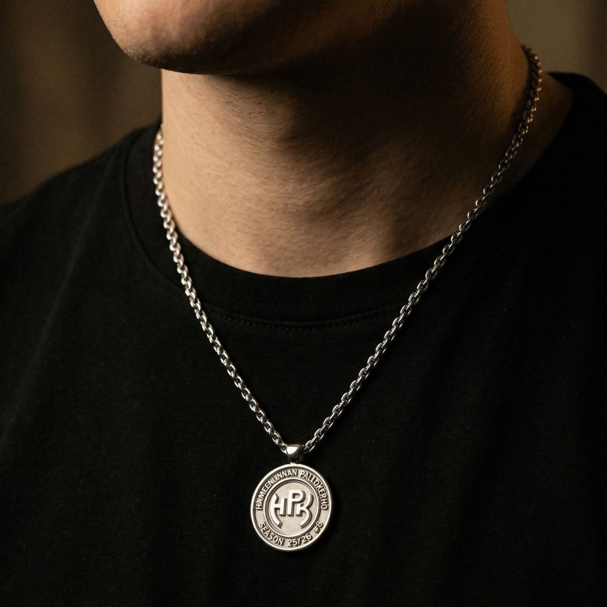 Riipuksen koko 25 mm, ketjun mitta 60 cm. Valmistettu kierrätetystä hopeasta.