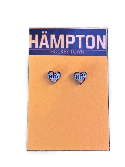 Sydämenmuotoiset nappikorvikset HPK-logoilla. Korvikset on käsintehdyt, joten jokainen pari on uniikki.