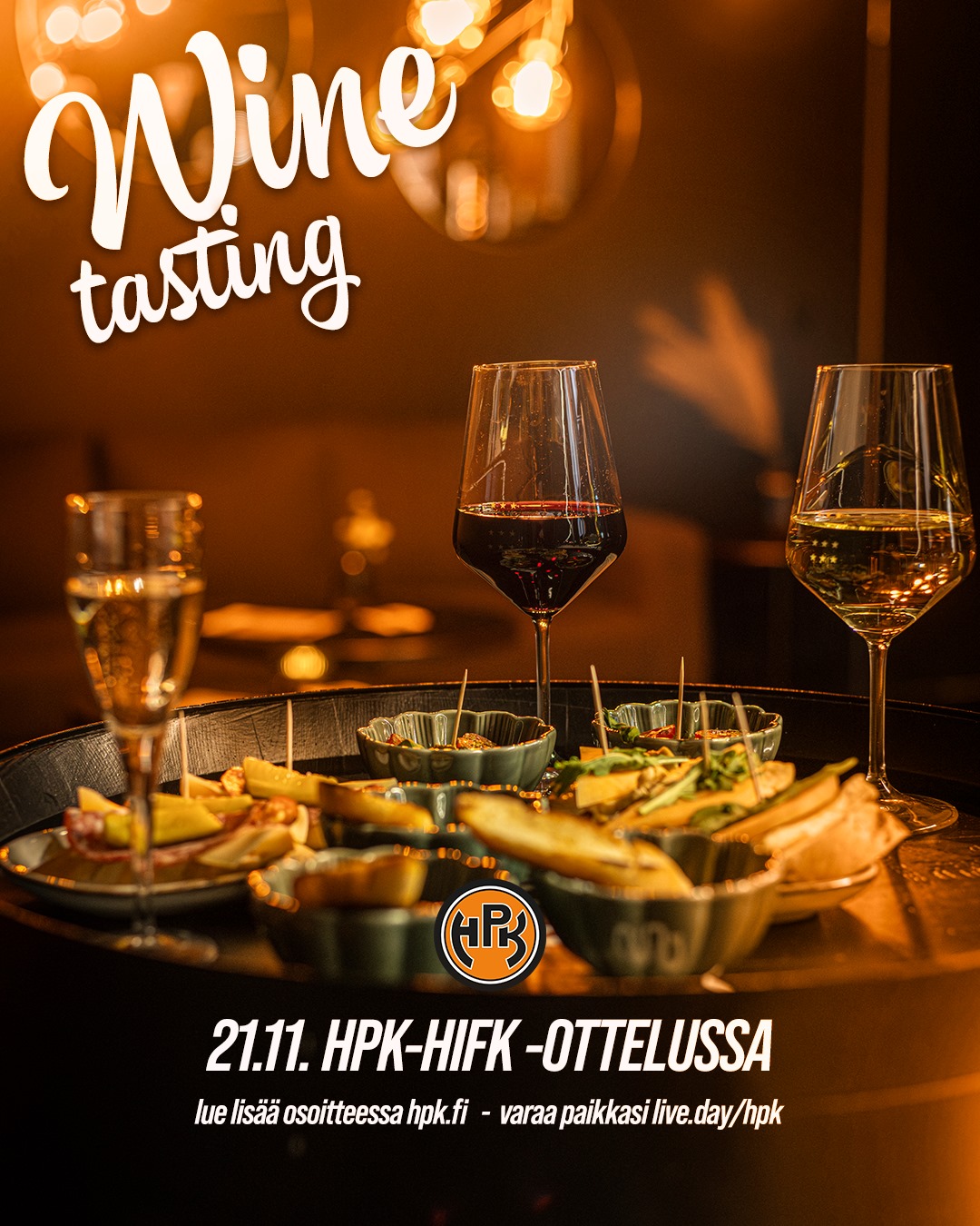 Tervetuloa HPK–HIFK-pelin etkoille maistelemaan viinejä! Virittäydy pelitunnelmaan ja tule maistelemaan neljä huolella valittua espanjalaista viiniä. Tastingin vetää Eleonora Nucci, kokenut viiniasiantuntija, joka vie teidät matkalle Espanjan makumaailmaan. Pääset mukaan viinien maisteluun 23 € hintaan!
